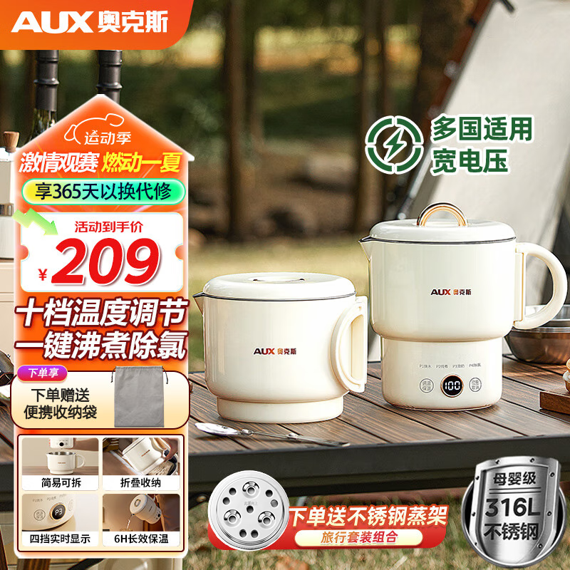奥克斯便携式烧水壶电水壶折叠水壶电热水壶迷你旅行316L不锈钢智能数显保温水壶【蒸架款】AAS-05ASBP01价格:209.00元!