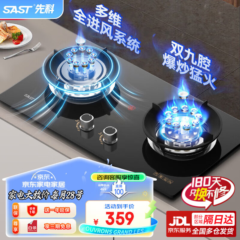 先科(SAST) 燃气灶双灶家用天然气液化气5.2KW煤气灶台式嵌入式两用玻璃灶台 (天然气)【双九腔款】5.2KW九腔铜盖/聚能防风价格:459.00元!