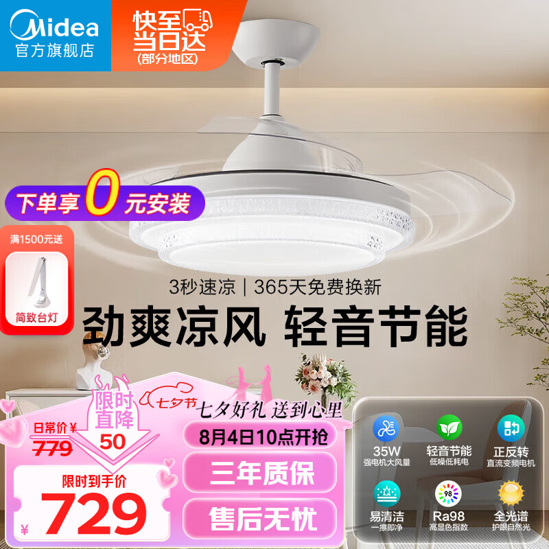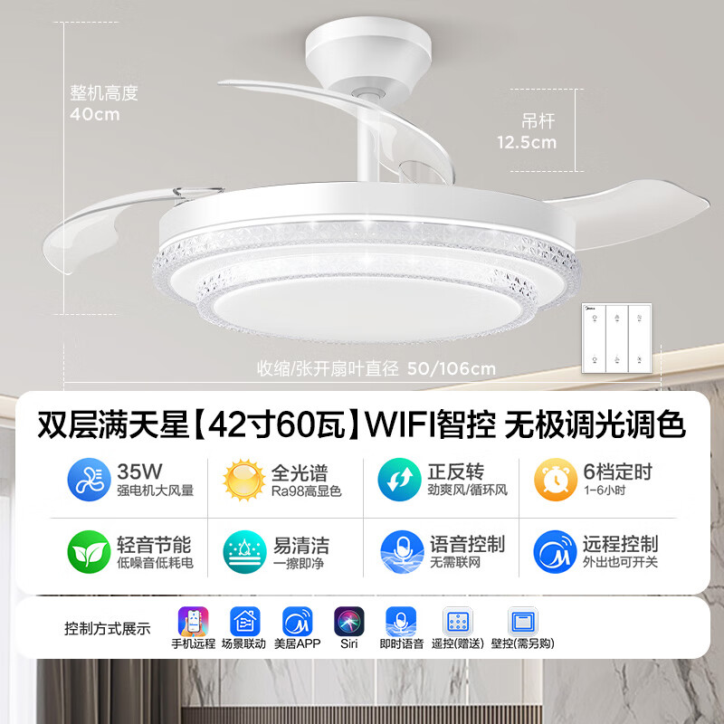 美的(Midea)吊扇灯风扇灯LED照明隐形餐厅卧室客厅防蓝光语音42寸灯饰灯具价格:779.00元!