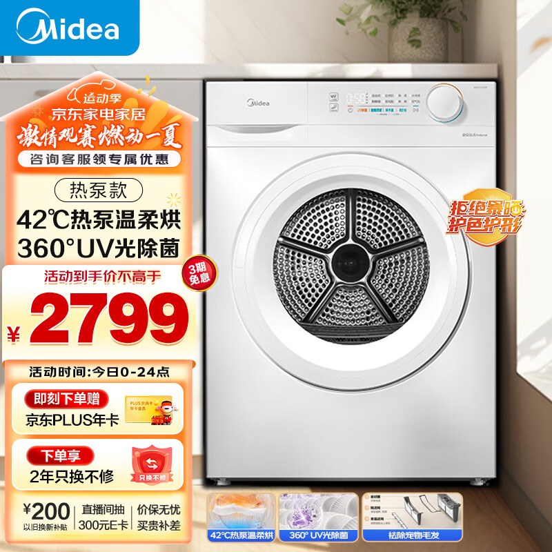 美的(Midea)10公斤热泵烘干机 干衣机家用 除螨除潮 多重毛屑过滤 紫外线除菌 MH100V11F价格:2799.00元!