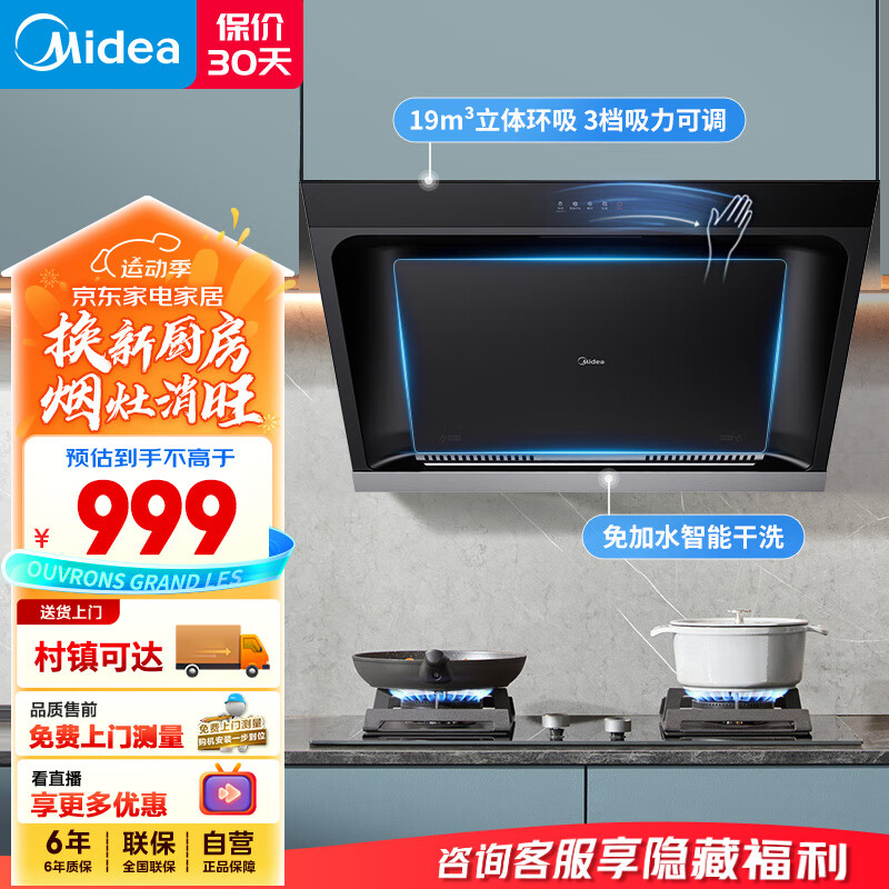美的(Midea)抽油烟机 家用厨房侧吸式吸油烟机大吸力 自动清洗挥手智控 脱排油烟机J30升级款JP32价格:999.00元!