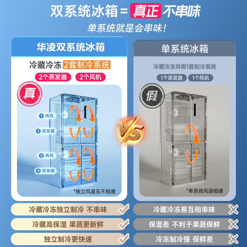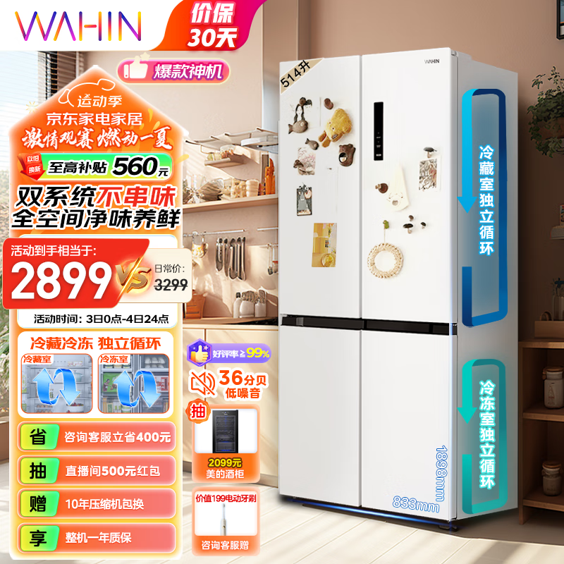 华凌 美的冰箱出品539双系统双循环十字四开门冰箱白色防串味一级能效风冷无霜家用大容量HR-539WSPZ价格:3299.00元!