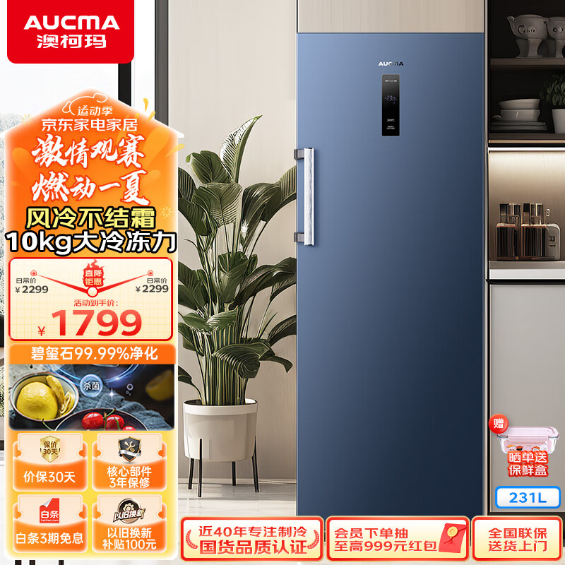澳柯玛(AUCMA)231升立式冰柜 家用冰柜大容量 冷藏柜冷冻柜转换 风冷无霜冷柜冰箱 一级能效 晶韵蓝 BD-231WNE价格:1799.00元!