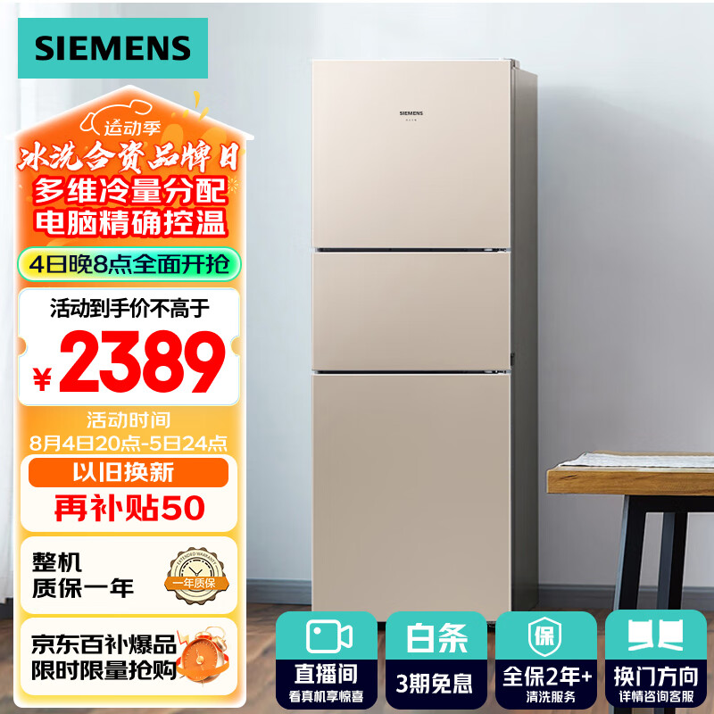 西门子(SIEMENS) 271升风冷三门大容量家用冰箱双效过滤控温浅金色以旧换新BCD-271W(KG28NV230C)价格:2499.00元!