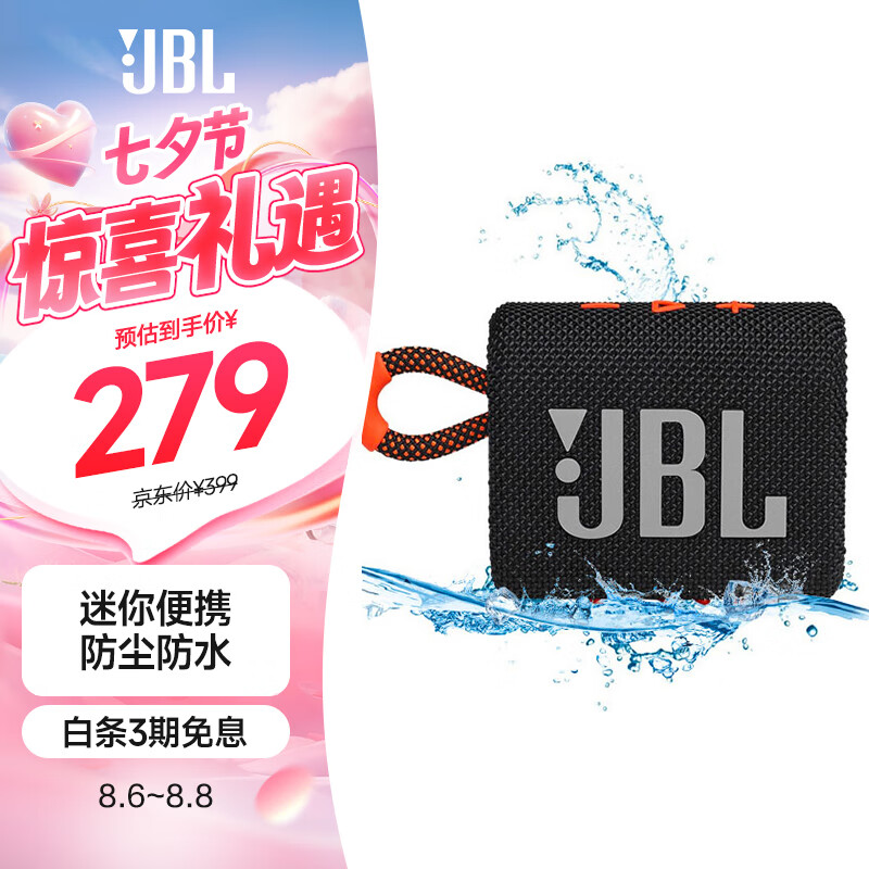 JBL GO3 音乐金砖三代 便携蓝牙音箱 低音炮 户外音箱 迷你音响 防水防尘 礼物小音响 黑拼橙色价格:279.00元!