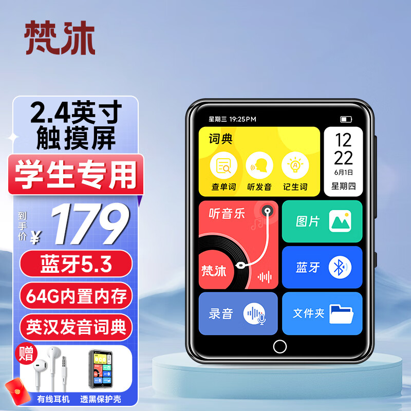 梵沐PA01 64G mp4/mp3播放器 无损音乐随身听 学生听英语听力复读机 2.4英寸发声词典外放蓝牙5.3价格:179.00元!