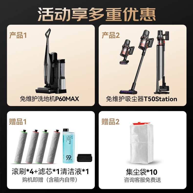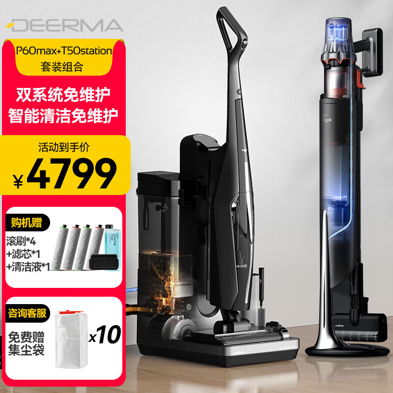 德尔玛(Deerma)【双基站套装】P60Max免维护洗地机+T50S自集尘吸尘器 自动清洗自动上下水热风烘干除菌价格:4799.00元!