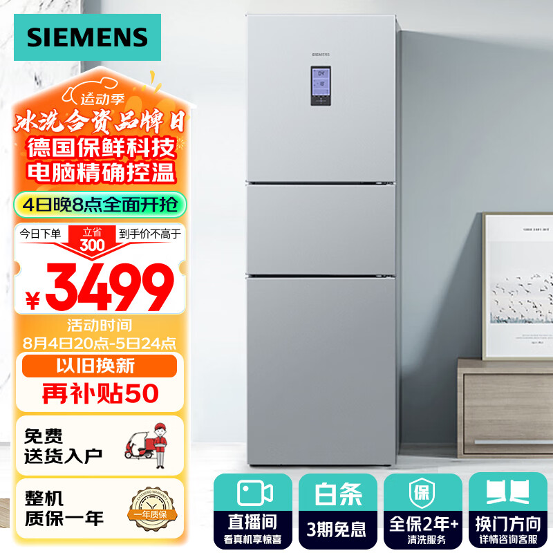 西门子(SIEMENS)306升 风冷无霜三门家用大容量冰箱锁水保鲜双效过滤以旧换新BCD-306W(KG32HA26EC)价格:3499.00元!