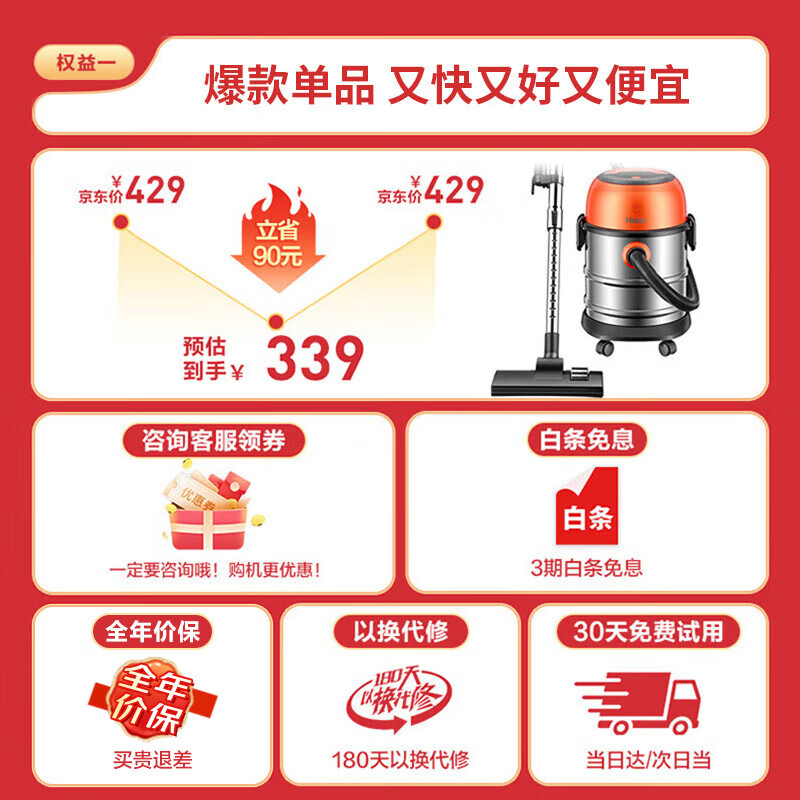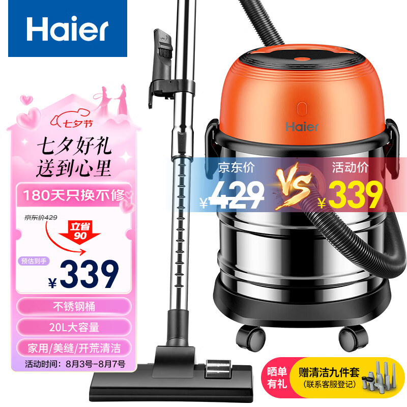 海尔(Haier)桶式吸尘器 20L大容量干湿吹三用大功率大吸力家用吸尘器HZ-T720价格:299.00元!