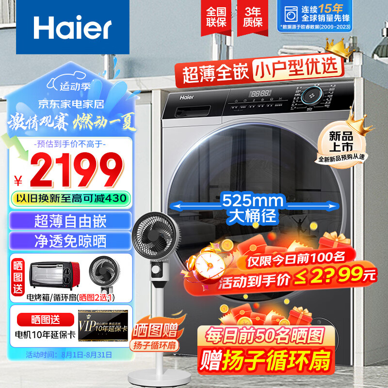 海尔(Haier)【24年上市】滚筒洗衣机8公斤超薄家用全自动洗衣机525大筒径小户型嵌入式变频节能洗衣机mate33s价格:2399.00元!