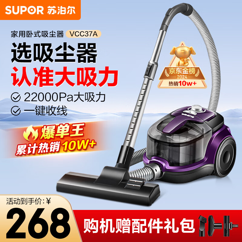 苏泊尔(SUPOR)卧式吸尘器22KPa家用大吸力地毯清洁大功率宠物家庭吸尘器小型带一键收线 VCC37A-13价格:268.00元!