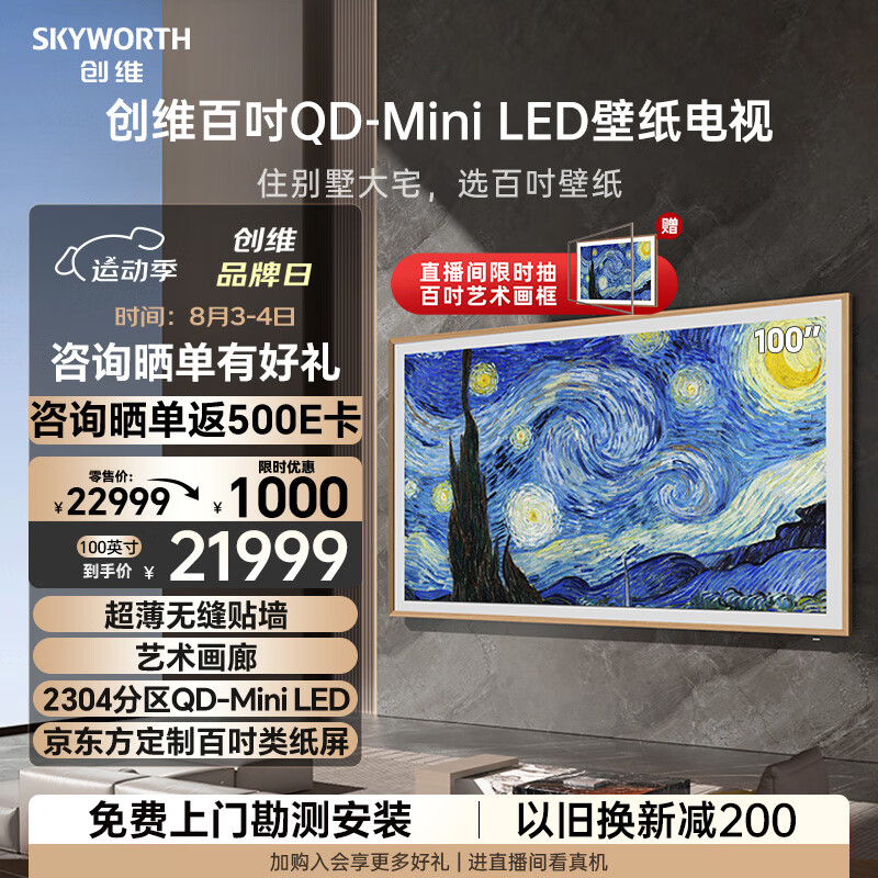 创维壁纸电视100A7E Pro 100英寸QD-Mini LED超薄无缝贴墙媲美oled 类纸屏艺术80-100英寸电视机价格:21999.00元!
