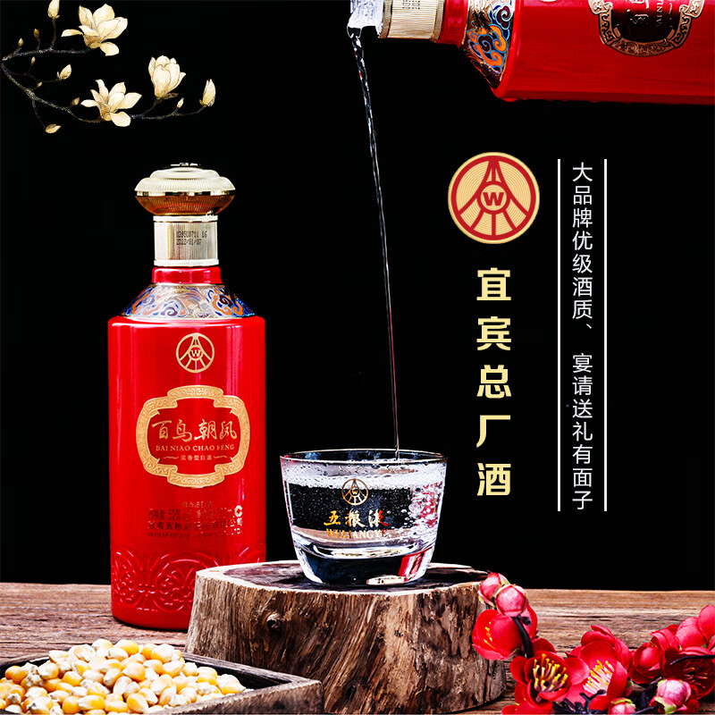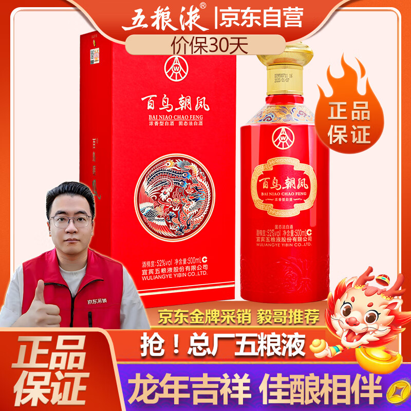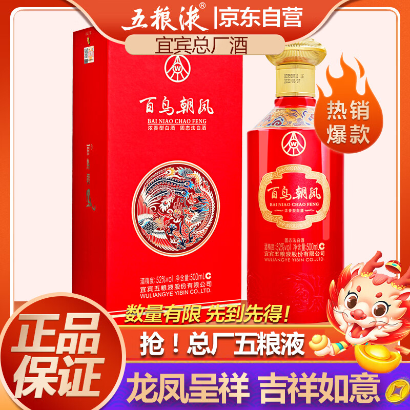 五粮液百鸟朝凤五彩红浓香型白酒礼盒52度500ml龙年节日高度纯粮喜酒水价格:168.00元!