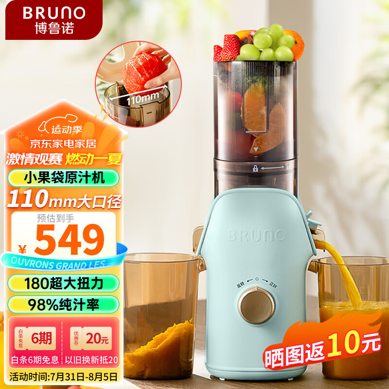 BRUNO原汁机多功能大口径家用全自动低速电动冷压榨果蔬榨汁机破壁豆浆养生果汁机渣汁分离薄荷绿价格:549.00元!