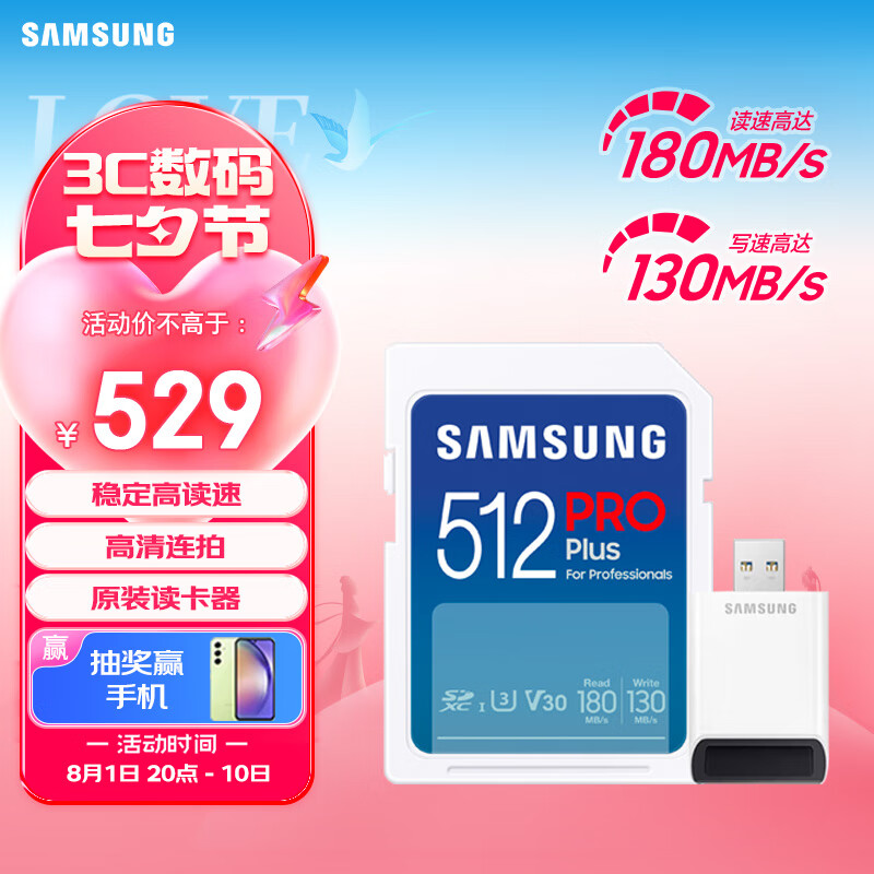 三星(SAMSUNG)512GB SD内存卡读卡器套装 高速PRO蓝卡 V30 SD相机内存卡支持单反4K 读速180MB/s写速130MB/s价格:529.00元!