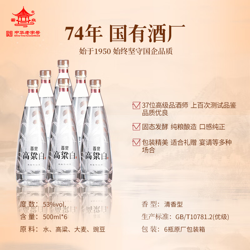晋泉清圣 高粱白酒 清香型白酒 53度 500ml*6瓶 整箱装价格:399.00元!