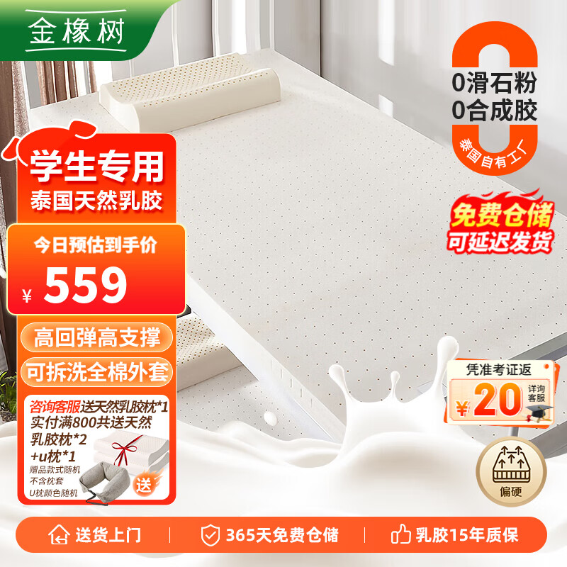 金橡树泰国进口天然乳胶床垫子宿舍学生单人床垫 100*190*5cm 云梦95D价格:799.00元!