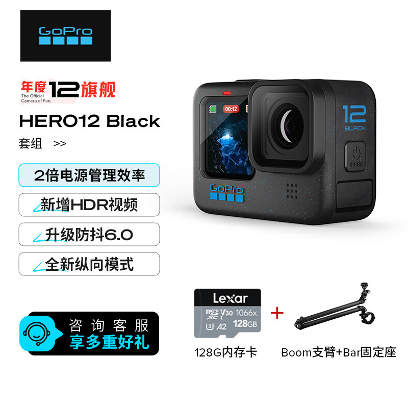 GoProHERO12 Black防抖运动相机 户外出行潜水防水相机 128G内存卡+Boom支臂+Bar固定座价格:3370.00元!