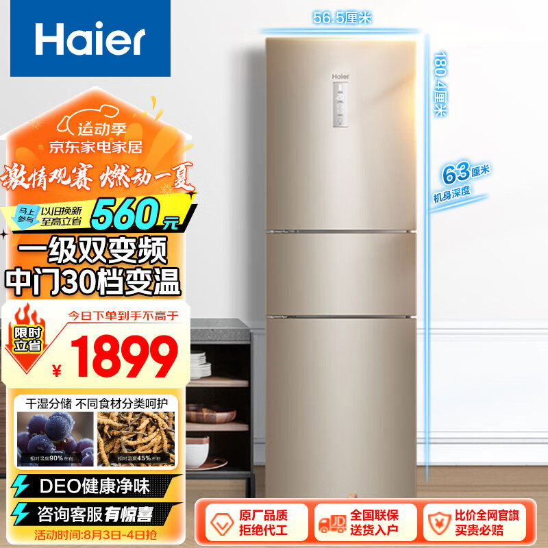 海尔(Haier)223升风冷无霜三开门多门电冰箱小户型家用宿舍出租房 一级能效1-2可用人以旧换新BCD-223WDPT价格:1899.00元!