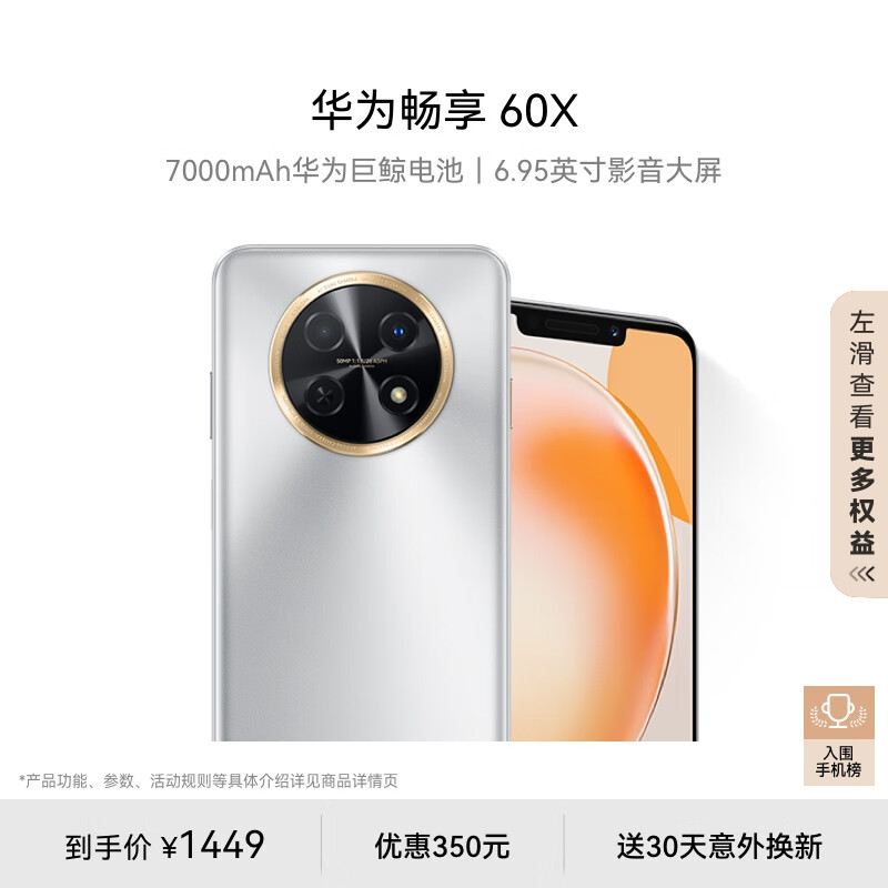 华为畅享 60X 7000mAh长续航 6.95英寸 影音大屏 128GB 皓月银 鸿蒙智能手机HUAWEI价格:1099.00元!