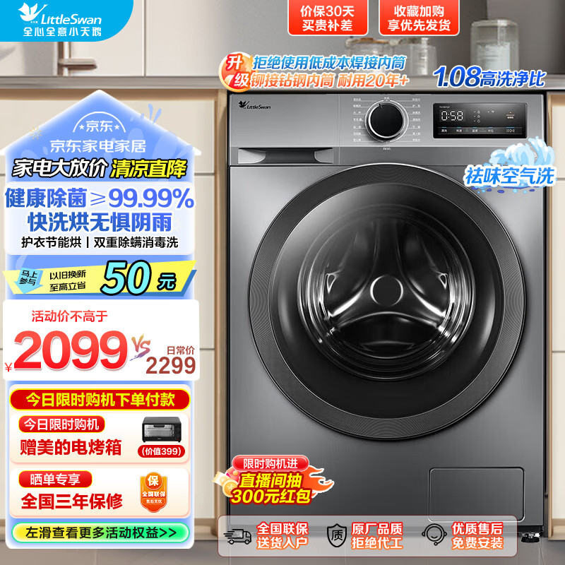 小天鹅(LittleSwan)洗衣机全自动洗烘一体 升级款10公斤大容量带烘干空气洗 1.08洗净比除螨智能家电家用变频 TD100YQ2价格:2199.00元!