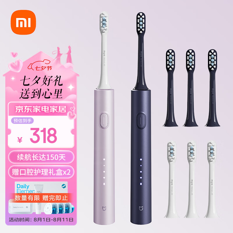 米家声波电动牙刷T302情侣装(蓝黑+霜紫)价格:318.00元!