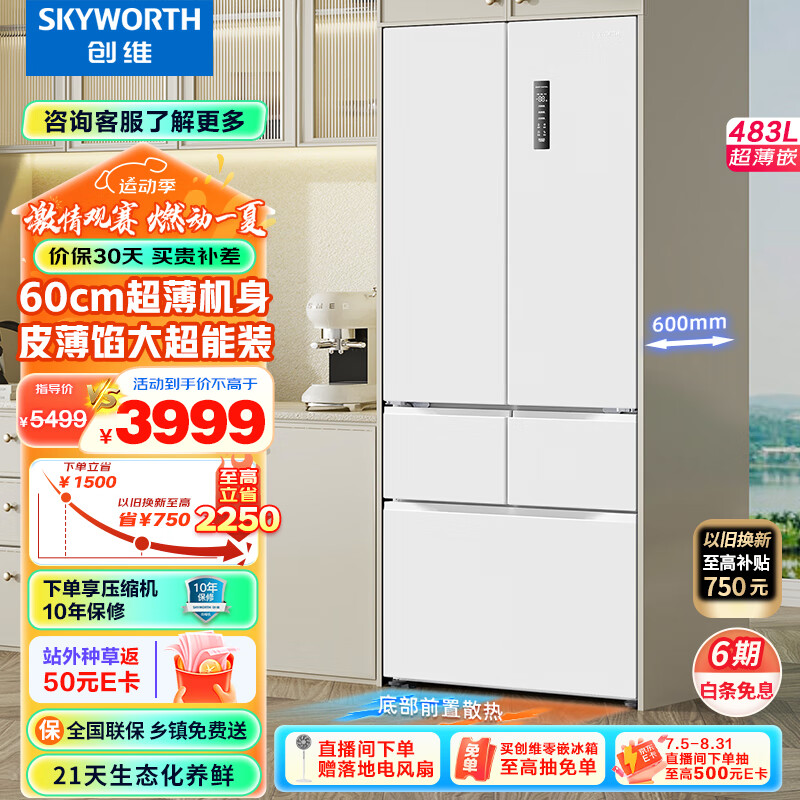 创维冰魔方 60cm零嵌483升法式五门多门日式超薄嵌入大容量冰箱无霜一级变频BCD-483W5DQB1白色P31价格:4499.00元!
