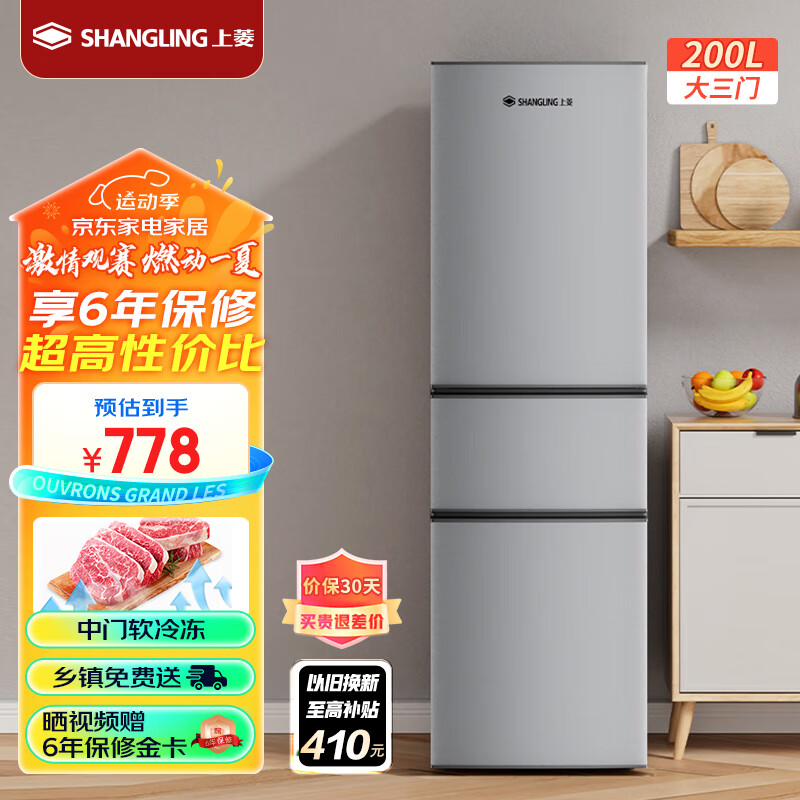 上菱200升三开门冰箱 排行前十名 家用大容量三门电冰箱小型 小户型租房宿舍以旧换新 BMM200L价格:779.00元!