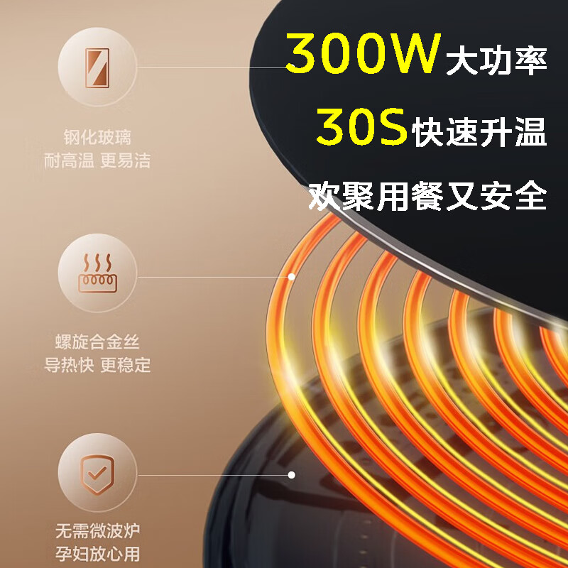 1、黑色钢化玻璃外观挺漂亮,底部塑料防滑效果不错,放在玻璃餐桌上不打滑,打开开关logo上方有个红色指示灯点亮,指示灯亮度较暗。开机1分钟左右开始明显发热,持续加热几分钟温度很高手无法接触,边缘和logo附近无加热。热饭很好用,建议远离小朋友。