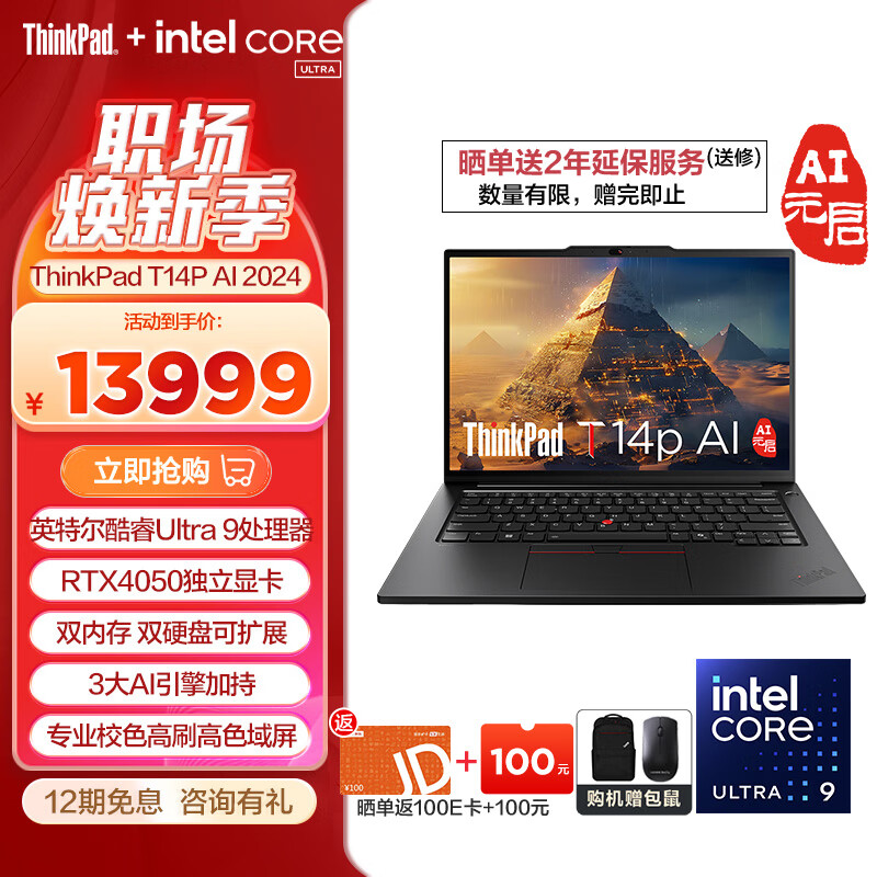 ThinkPad T14p AI 2024 全新酷睿Ultra处理器 联想高性能标压工程师本笔记本电脑办公轻薄本 Ultra 9-185H 32G 1T独显00CD价格:13999.00元!