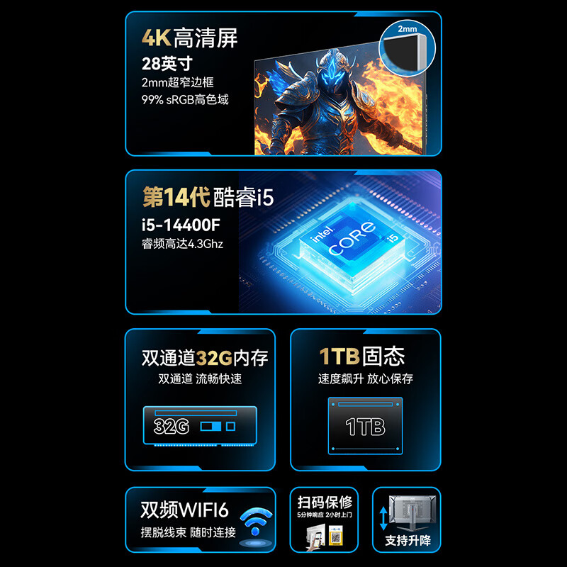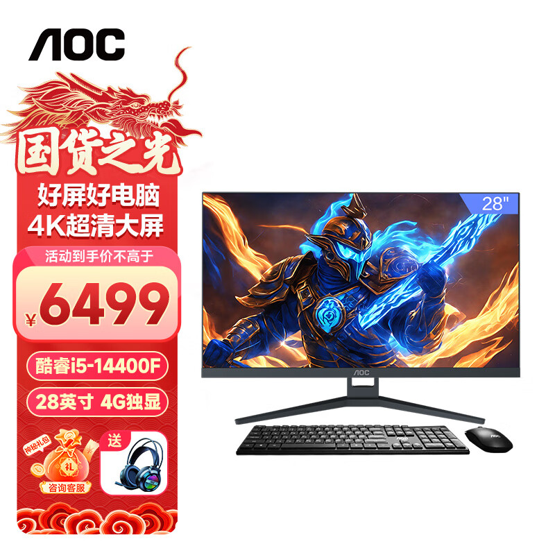 AOC的卢948 28英寸超清4K屏高端一体机台式电脑(14代i5-14400F 32G 1T RX550独显 双频WiFi)黑价格:6499.00元!