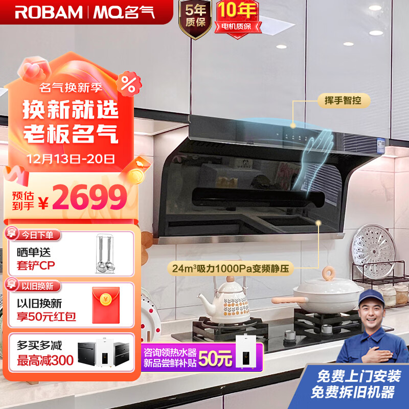 名气(MQ)老板抽油烟机7字型家用顶侧双吸变频油烟机家用24大吸力1000Pa变频烟灶套装双天然气A5508+6510B价格:2699.00元!