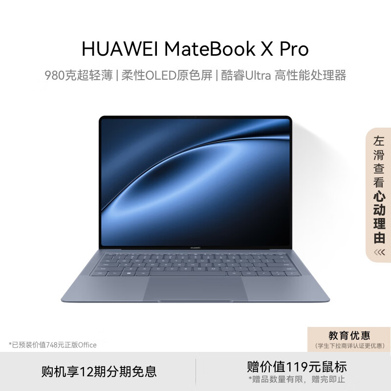 华为MateBook X Pro酷睿 Ultra 微绒典藏版笔记本电脑 980克超轻薄/OLED原色屏 Ultra9 32G 2T 晴蓝价格:14999.00元!