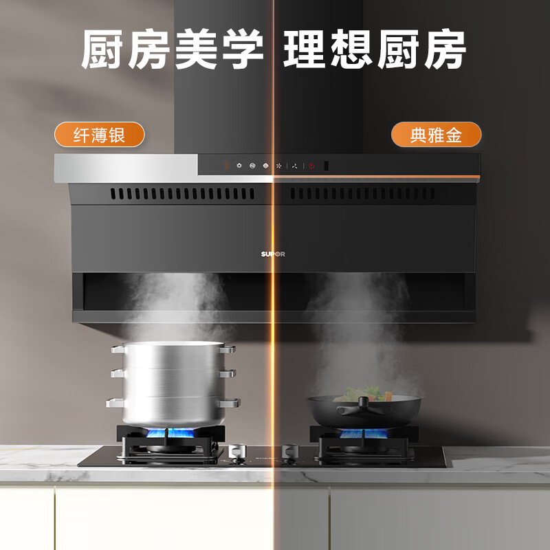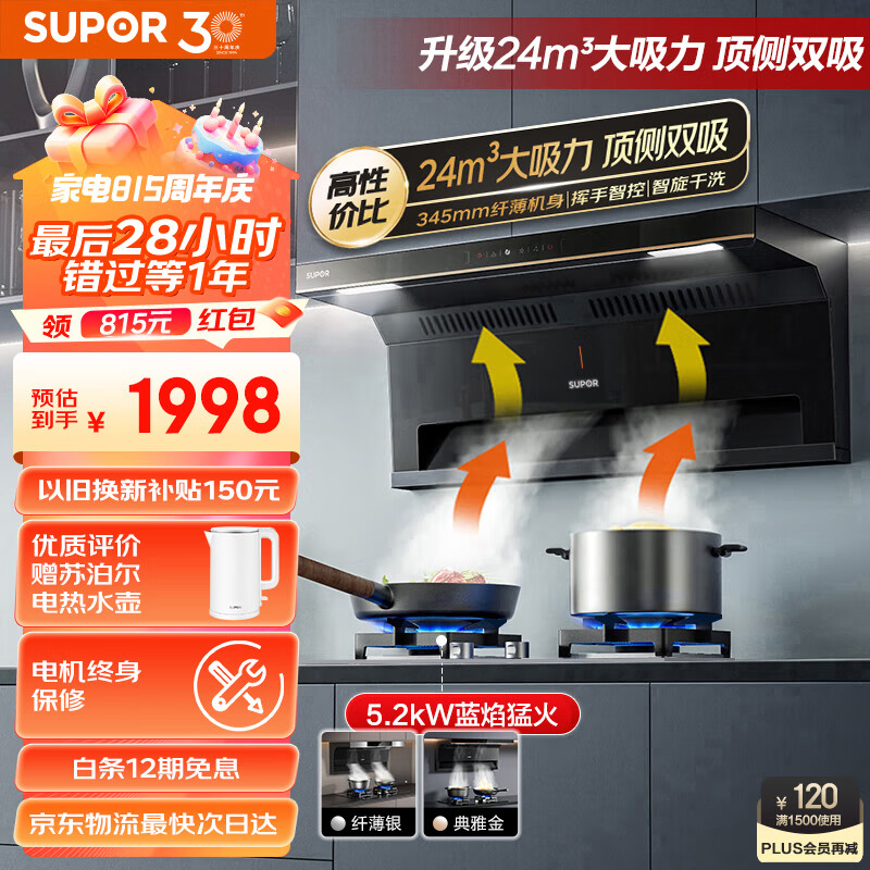 苏泊尔(SUPOR) 抽油烟机 顶侧双吸7字型烟灶套装24立方挥手免拆洗家用烟机燃气灶具套装DE15+DS35液价格:1998.00元!