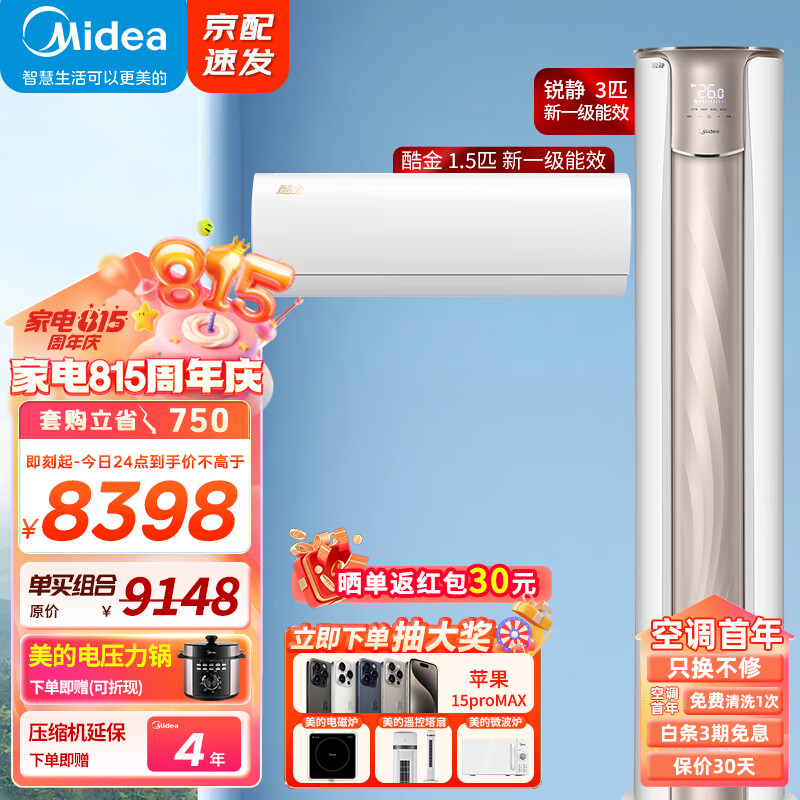美的(Midea)空调套装 新一级能效 一室一厅套餐 全直流变频冷暖自清洁一键防直吹 挂机酷金1.5匹+柜机锐静3匹价格:8398.00元!
