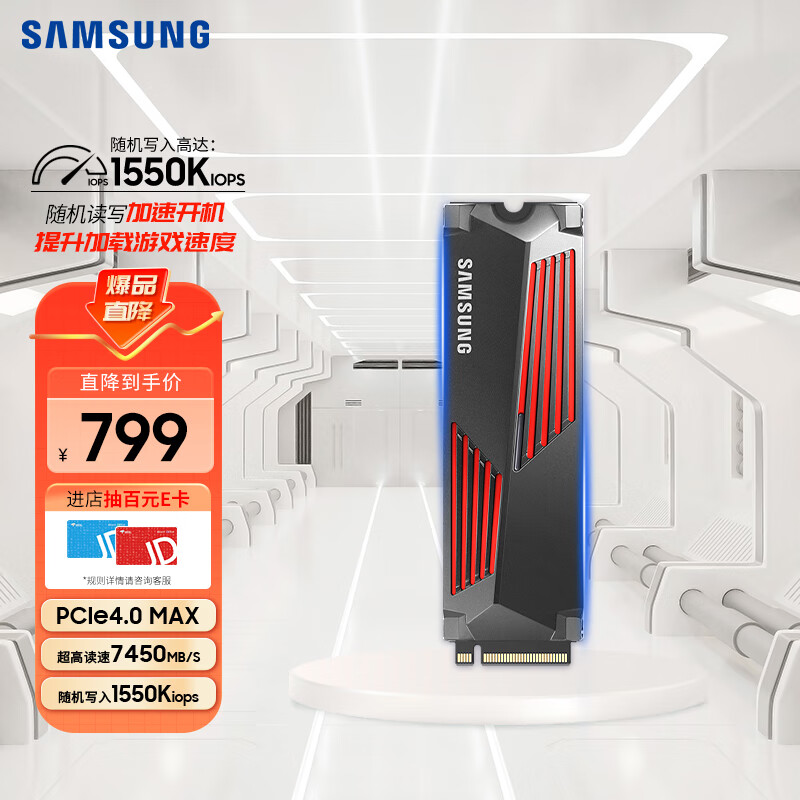 三星(SAMSUNG)1TB SSD固态硬盘 M.2接口(NVMe协议PCIe 4.0 x4) 990 PRO With Heatsink(散热片版)价格:799.00元!