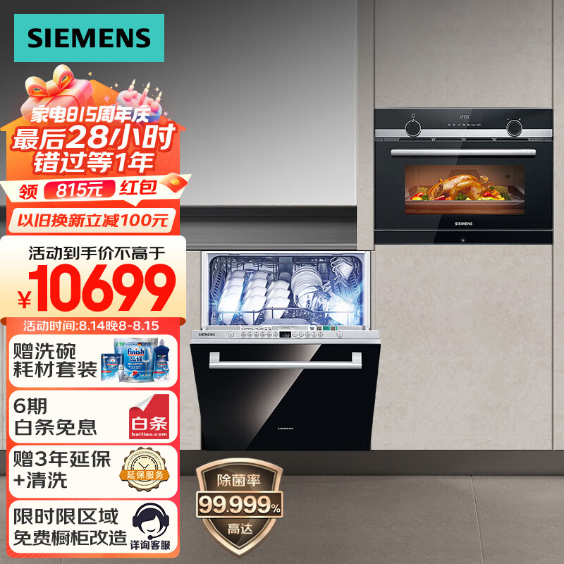 西门子洗嵌套装 14套嵌入式家用洗碗机+嵌入式微蒸烤炸一体机组合套装 SJ436(含黑门板)+CP565价格:10699.00元!