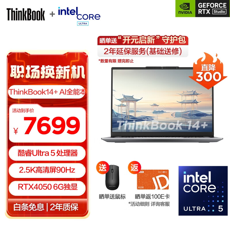ThinkPad联想ThinkBook14+2024 AI轻薄全能本 全新英特尔酷睿Ultra标压处理器 14.5英寸商务办公笔记本电脑 Ultra5 125H 16G 512G 0S独显价格:7699.00元!