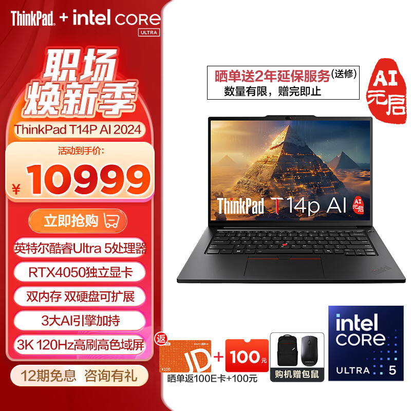 ThinkPad T14p AI 2024 全新酷睿Ultra处理器 联想高性能标压工程师本笔记本电脑办公轻薄本 Ultra 5-125H 32G 1T独显02CD价格:11499.00元!