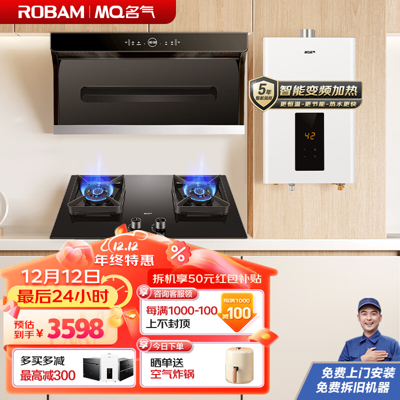 名气(MQ)老板抽油烟机烟灶套装7字型23吸力风量吸油烟机燃气热水器家用烟灶热三件套A5505+A6510B+R5A06-14价格:3598.00元!