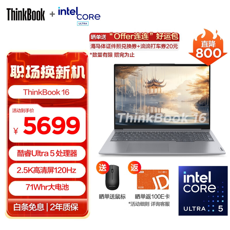 ThinkPad 联想ThinkBook 14/16 2024全新英特尔酷睿Ultra处理器 学生办公轻薄笔记本电脑 120Hz刷新率 16英寸 Ultra5 32G 1T 8MCD价格:5899.00元!