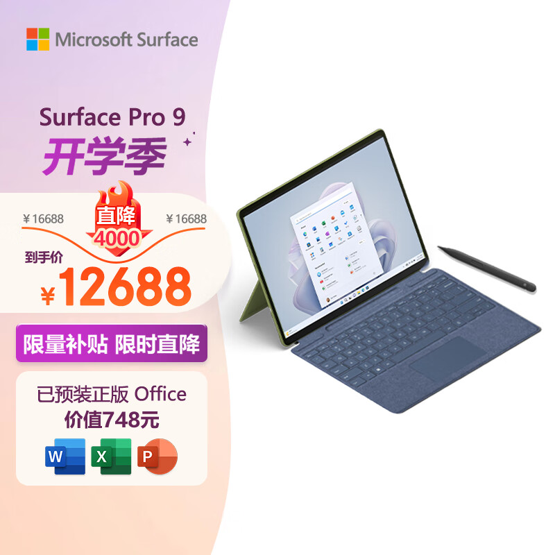 微软Surface Pro 9 森野绿+宝石蓝带触控笔键盘盖i7 16G+512G 二合一游戏平板13英寸120Hz屏笔记本电脑价格:12688.00元!