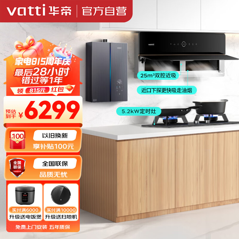 华帝(VATTI)16L水伺服静音下置风机燃热25风量变频大吸力油烟机5.2kW燃气灶多件套装i11210+76B+G5(天然气)价格:6299.00元!