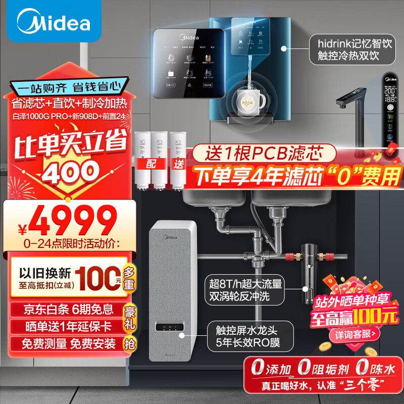 美的(Midea)省芯直饮冷热净水器套装【白泽1000pro+管线机908D+前置-24pro】hidrink 壁挂式加热一体净饮机价格:4999.00元!