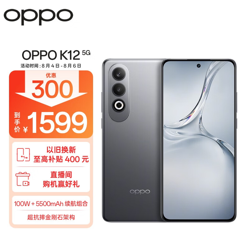 OPPO K12 5G 8GB+256GB 星夜 100W+5500mAh续航组合 第三代骁龙7旗舰芯 直屏新款游戏智能学生 AI手机价格:1799.00元!