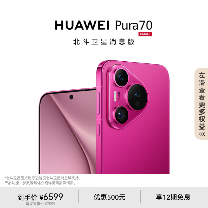 华为(HUAWEI)Pura 70 12GB+1TB 樱玫红 北斗卫星消息版 超高速风驰闪拍 第二代昆仑玻璃 华为P70智能手机价格:6599.00元!