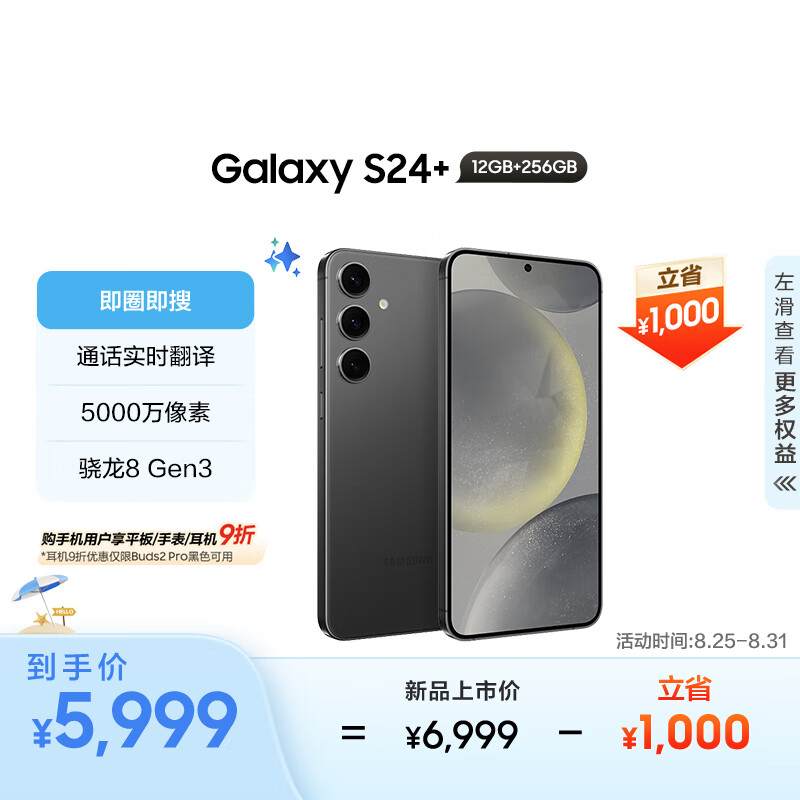 三星(SAMSUNG)Galaxy S24+ AI手机 智享生活办公 5000万像素 拍照手机 第三代骁龙8 游戏手机 12GB+256GB 水墨黑价格:5999.00元!