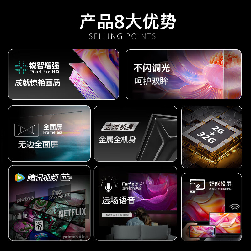 2、外形外观:非常完美,极窄平非常好看。运行速度:运行流畅,不卡顿屏幕音效:显示还是飞利浦的显示清楚,比其他的好多了尺寸大小:观看距离三米多,75寸的刚刚合适。