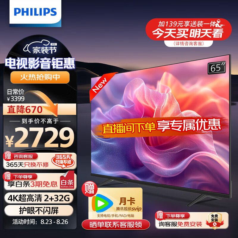 飞利浦(PHILIPS)65英寸4K超高清智慧显示投屏家用客厅智能液晶平板LED彩电视机65PUF7099/T3以旧换新价格:2729.00元!