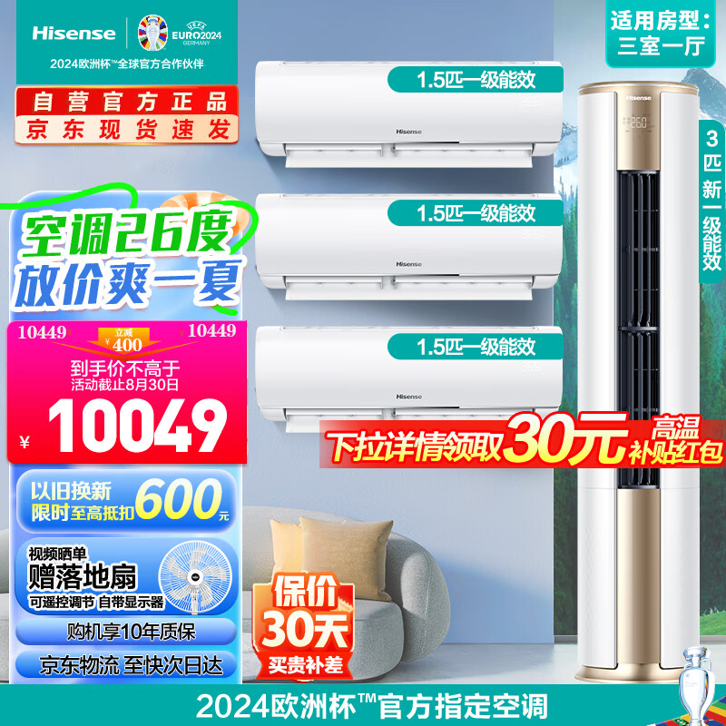 海信(Hisense)空调套装三室一厅套装 一套购齐 新一级能效变频挂机柜机 3匹E500+1.5匹E290 以旧换新价格:10049.00元!